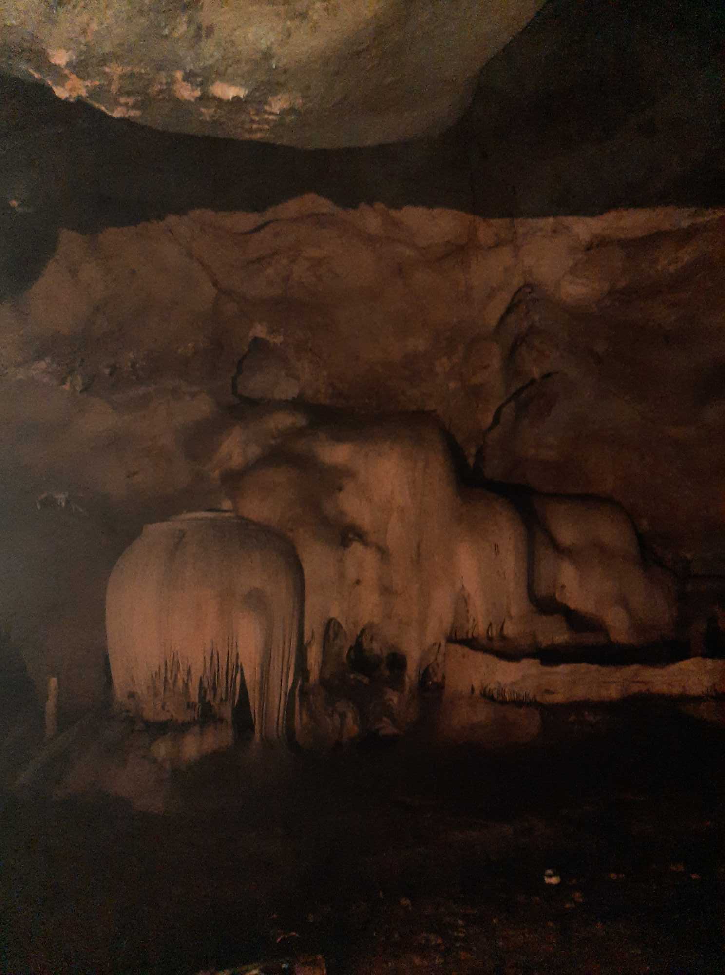 Unweit des Höhleneingangs verleiht ein Mönch, gegen eine kleine Spende, Taschenlampen. Wir waren die einzigen Besucher der mehrere hundert Meter langen und wenig ausgebauten Höhle. Eigentlich kann man sich zwar nicht wirklich verirren, aber so ganz alleine in einer großen, langen, dunklen und nicht beschilderten Höhle ist es schon etwas unheimlich. Die einzigen anderen Lebewesen waren die Fledermäuse und unzählige Spinnen auf dem Boden.
