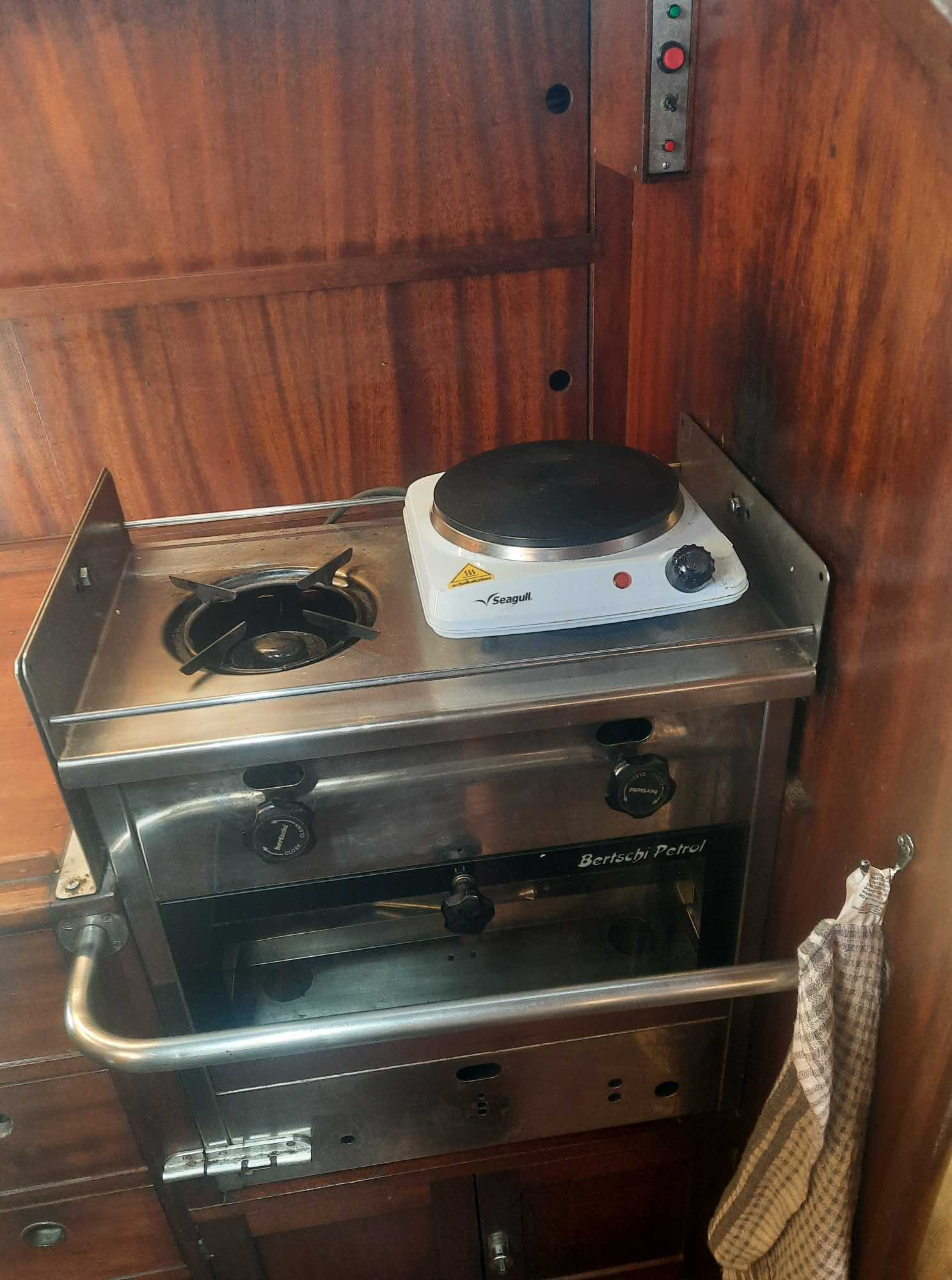 Der gute alte Petroleumherd mit seinem Backofen bleibt uns aber als Backup System erhalten. Auch dient er als kardanischer aufgehängter Stellplatz für die Herdplatte.