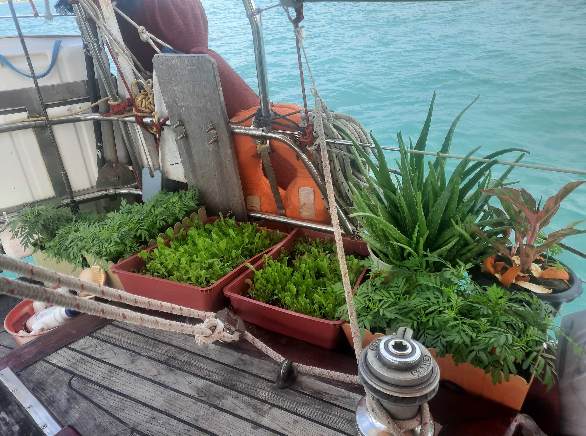 Die Barbaco ankert derweil immer noch in der Chalong Bucht und wartet auf ihre neue Genua. Dank des neuen Unterwasseranstriches endlich ohne Muschelbewuchs. Hoffentlich gilt das auch für die Schiffsschraube. Die habe ich mit einer Mülltüte abgedeckt, in der Hoffnung, dass die Unterwasserbewohner nicht im Dunkeln leben wollen.