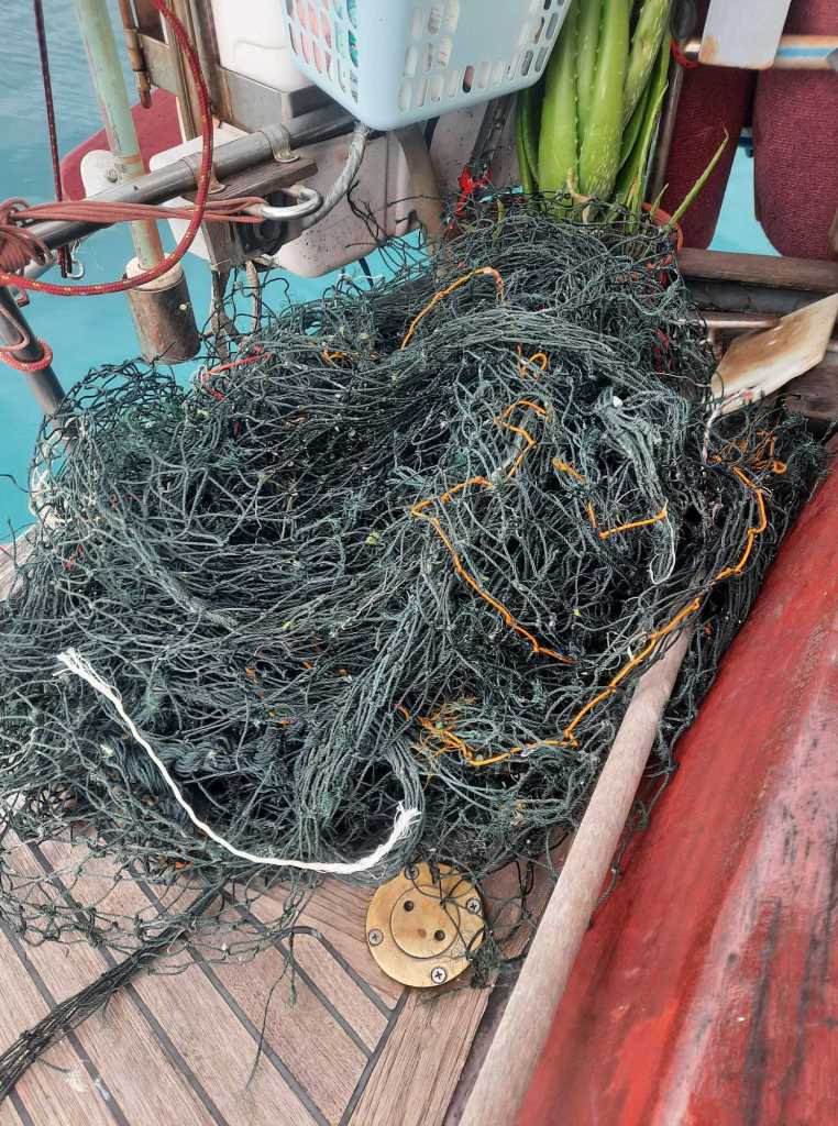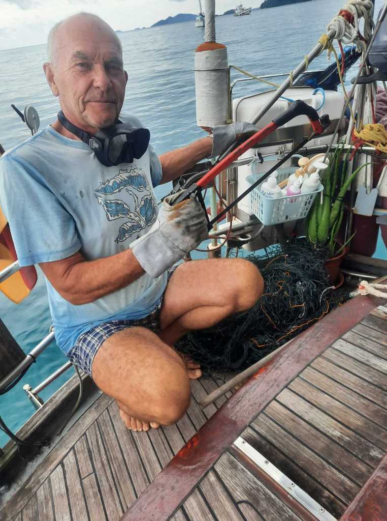 Mit einer Säge bewaffnet, hatte ich ca. eine Stunde unter Wasser zu arbeiten, um ihn aus einem umherteibenden alten Fischernetz zu befreien.