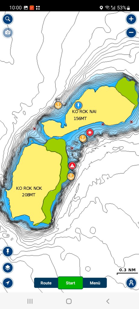 Zum Glück hat die Barbaco eine halbwegs gute Taschenlampe und wir fanden schnell eine andere Boje. Es war gerade Niedrigwasser und die Wassertiefe betrug über 10 m. Also war alles ok und wir konnten beruhigt ins Bett gehen.